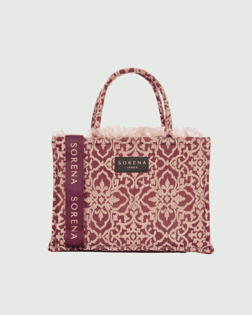 Η Bordo tote Bag-Sorena είναι κατασκευασμένη από βελούδινο και μεταξωτό ύφασμα με όμορφο μοτίβο.